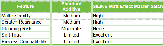 SILIKE Matte Effect Masterbatch not only solves common matte stability and scratch issues but also ensures process efficiency and product aesthetics.